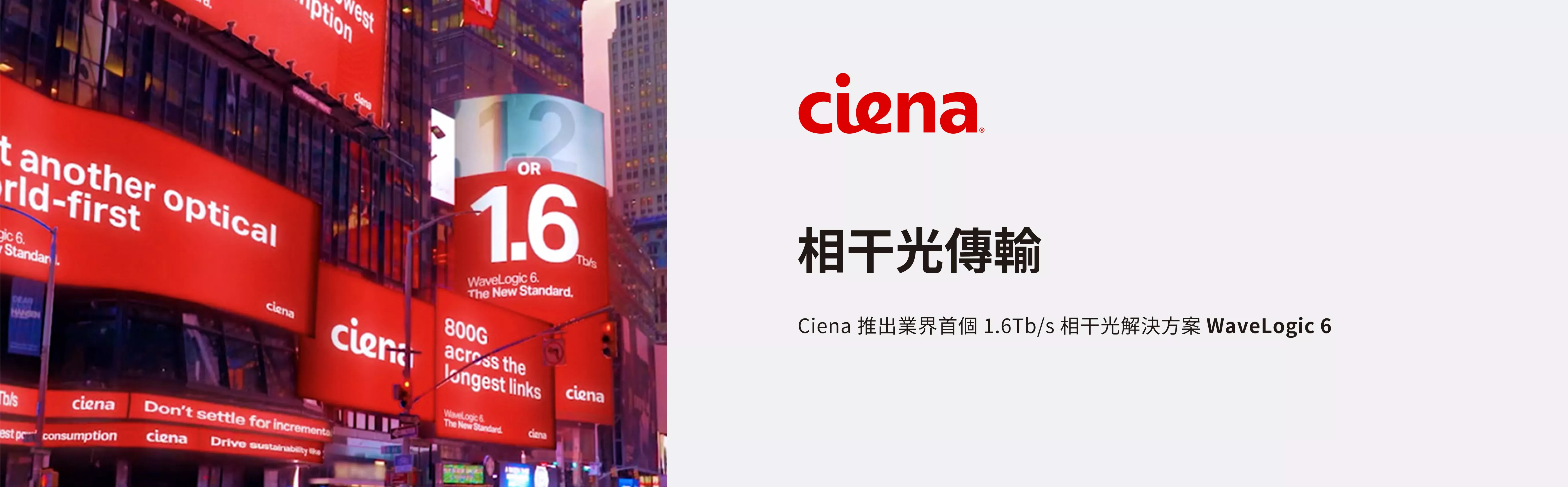 Ciena 於 1992 年成立,相干光技術的先驅,率先將 40G、100G、400G 及 800G 相干技術引入業界的公司。Ciena 的 WaveLogic 6 針對下一代路由資料路徑、相關批發服務所需的高容量傳輸進行了最佳化,將支援城域 ROADM 部署的高達 1.6Tb/s 的單載波波長、最長鏈路的 800Gb/s 以及 1000 公里距離的節能 800G 可插拔設備。